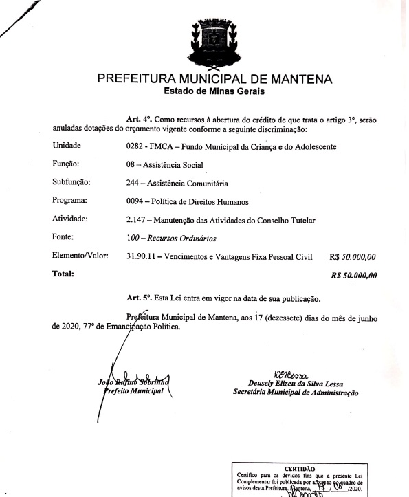Também fica autorizado o Poder Executivo Municipal abrir crédito adicional especial até o limite de R$50.000,00 (cinquenta mil reais).