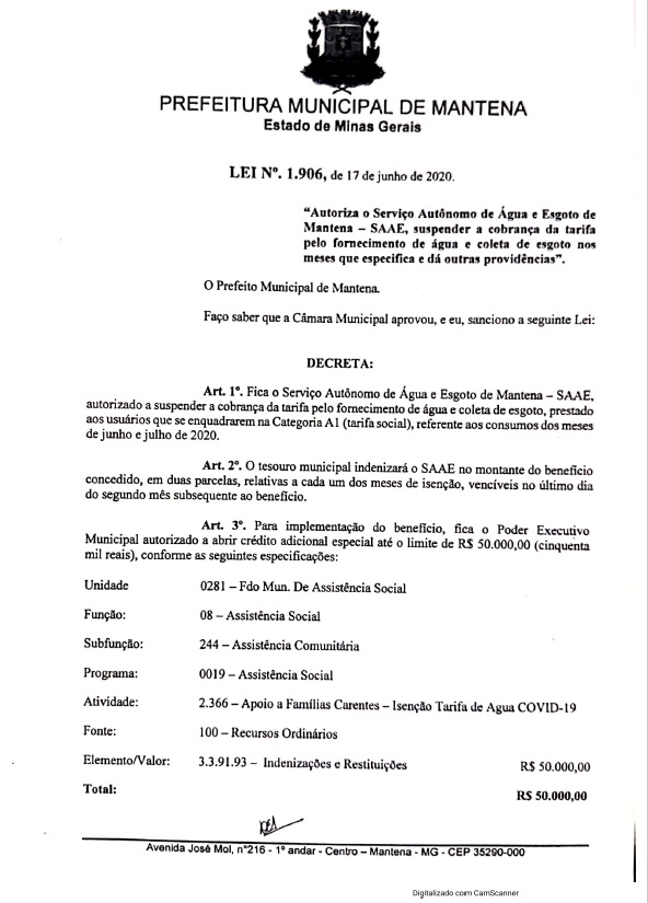 O SAAE de Mantena, por meio de sua imprensa oficial, vem comunicar que na última sessão ordinária da Câmara Municipal de Mantena, realizada no dia 15 de Junho, foi aprovado por unanimidade de votos, o projeto de lei n° 17/2020, enviado pelo Executivo Municipal, criando a Lei n° 1906, de 17 de junho de 2020, que autoriza o SAAE – Serviço Autônomo de Água e Esgoto a suspender a cobrança de contas de água da A1 Categoria Social, nos meses de referência Junho e Julho/2020.